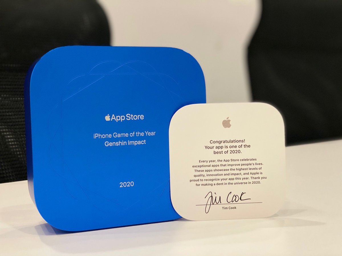 その後ようやく、受賞者らの手元に物理的なトロフィーが到着し始めたしだい。ベストiPhoneアプリケーションに選ばれたWakeout!やベストiPhoneゲームに表彰された原神の関係者たちが手にしたアワード(物理)をTwitter上に、喜びの声とともに公開しています。