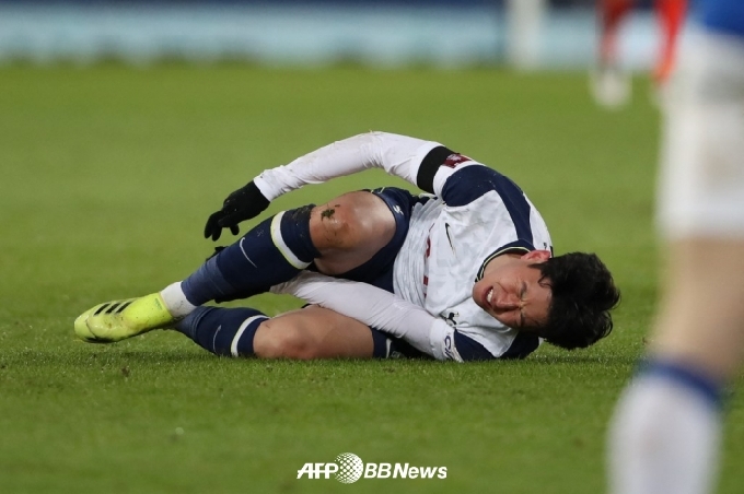 | 상대의 거친 수비에 넘어진 손흥민. /AFPBBNews=뉴스1 |